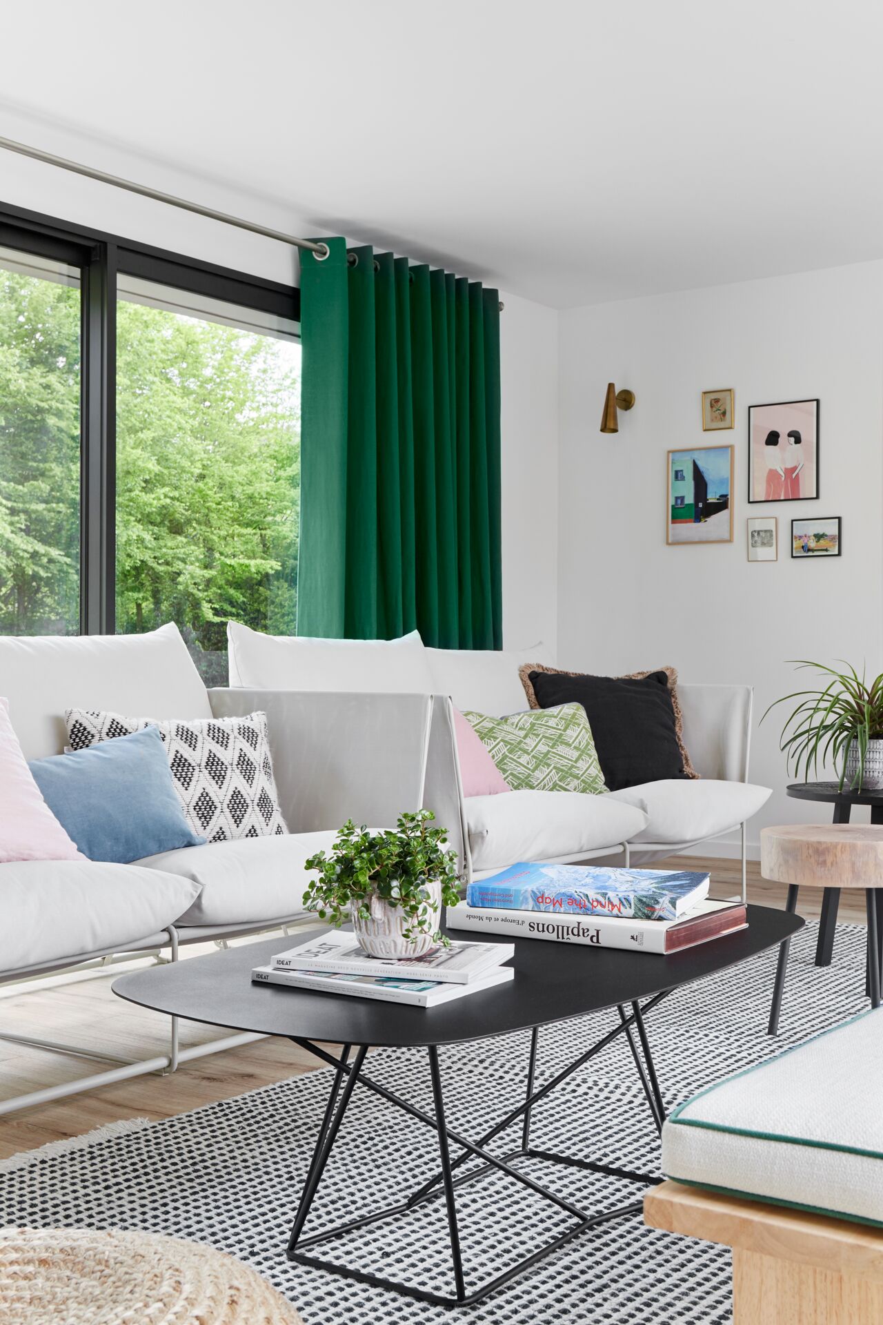 Attenant, le salon tout en longueur joue la carte d’un espace ouvert sur l’extérieur et d’une mise au vert assumée, grâce à l’épais rideau bicolore en coton velouté faisant écho au jardin arboré.