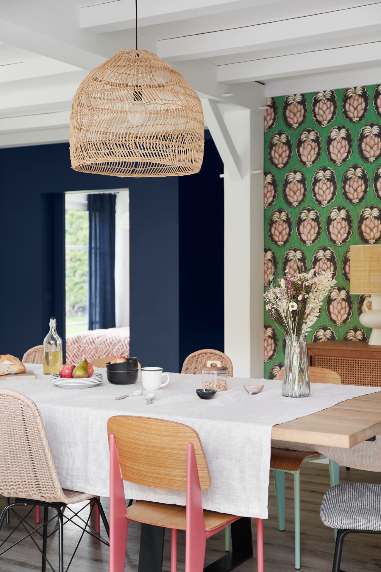Derrière la porte d’entrée s’ouvrent une pièce de vie lumineuse et une cuisine fonctionnelle, prêtes à recevoir les grandes tablées conviviales. Côté palette, les poutres en bois rafraîchies et les murs blancs contrastent avec un papier peint d’inspiration cubaine insufflant instantanément un esprit d’ailleurs.